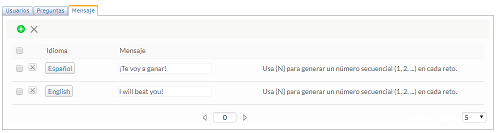 Aquí, hay que crear un mensaje corto que los jugadores recibirán en sus dispositivos móviles. Selecciona tu idioma al hacer clic al botón «** Seleccionar por favor **» e introduce tu mensaje. Si quieres que el reto automático aparezca en otro idioma, repite el mismo proceso y selecciona el otro idioma. Haz clic en Guardar para grabar el reto automático.
